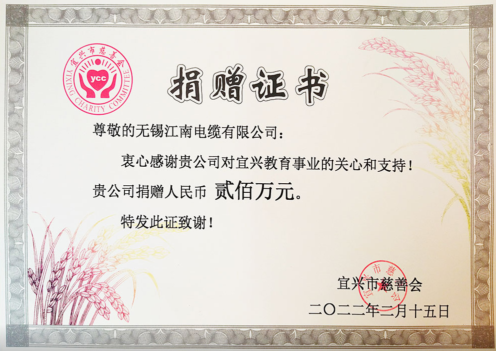 向宜兴市慈善会捐赠200万元支持宜兴教育事业